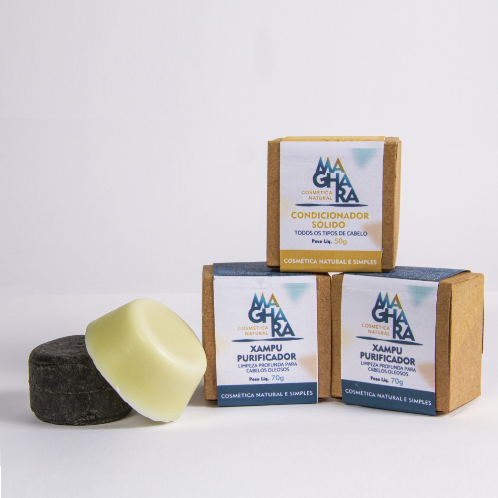 O Condicionador sólido Maghara traz emoliência, brilho, maciez e desembaraço para todos os tipos de cabelo. É uma união de óleos e manteigas vegetais, combinados a ceras vegetais que trazem consistência e emoliência aos fios.