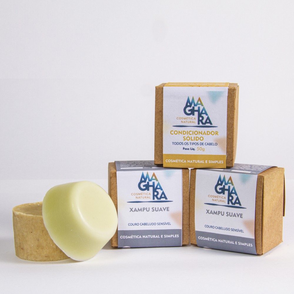 O Condicionador sólido Maghara traz emoliência, brilho, maciez e desembaraço para todos os tipos de cabelo. É uma união de óleos e manteigas vegetais, combinados a ceras vegetais que trazem consistência e emoliência aos fios.